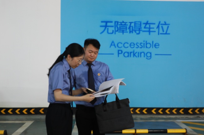 王毅(右)和同事在湖北省随州市曾都区某大型商场地下停车场,对无障碍设施整改情况进行“回头看”。