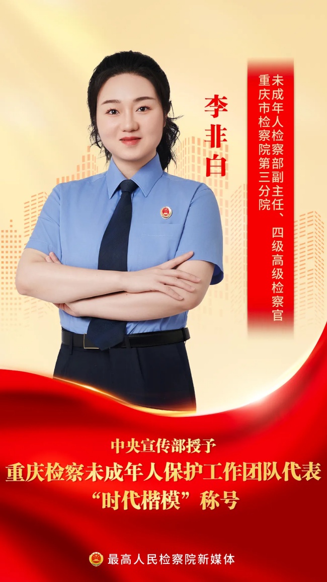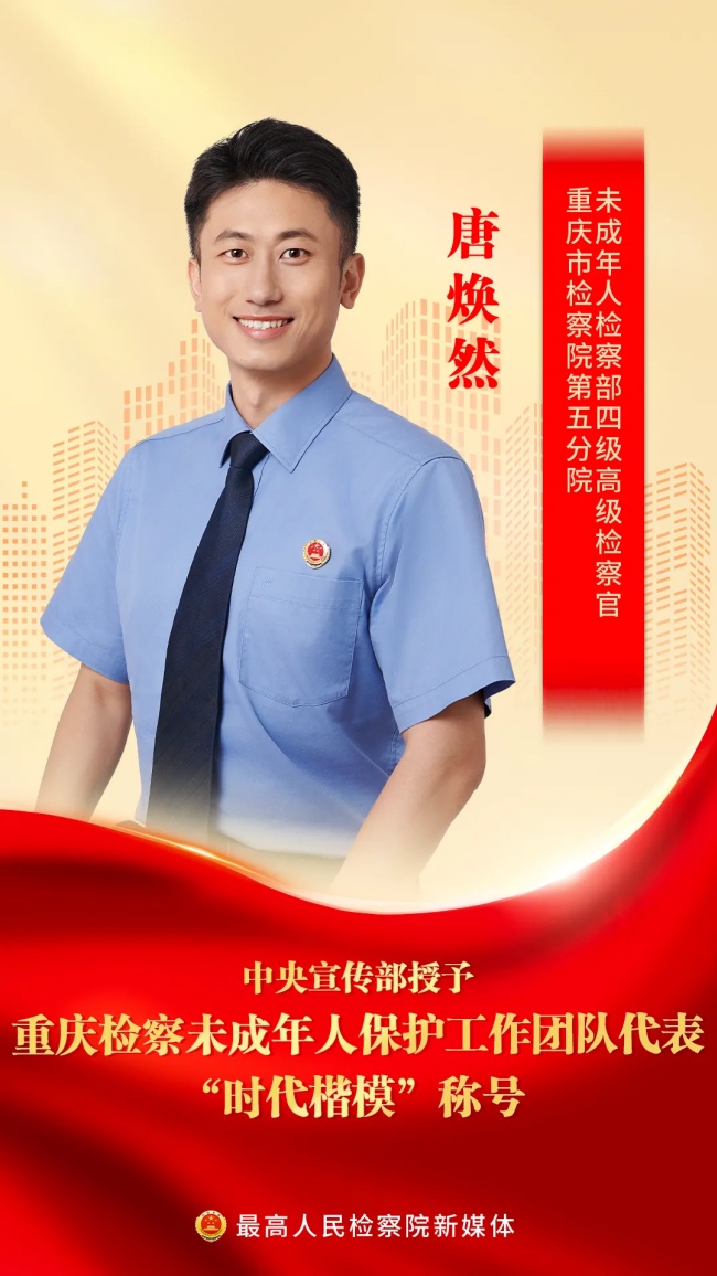 中央宣传部授予重庆检察未成年人保护工作团队代表“时代楷模”称号,褒扬他们是“德法相伴、倾情守护未成年人健康成长的典范”,号召全社会向他们学习。